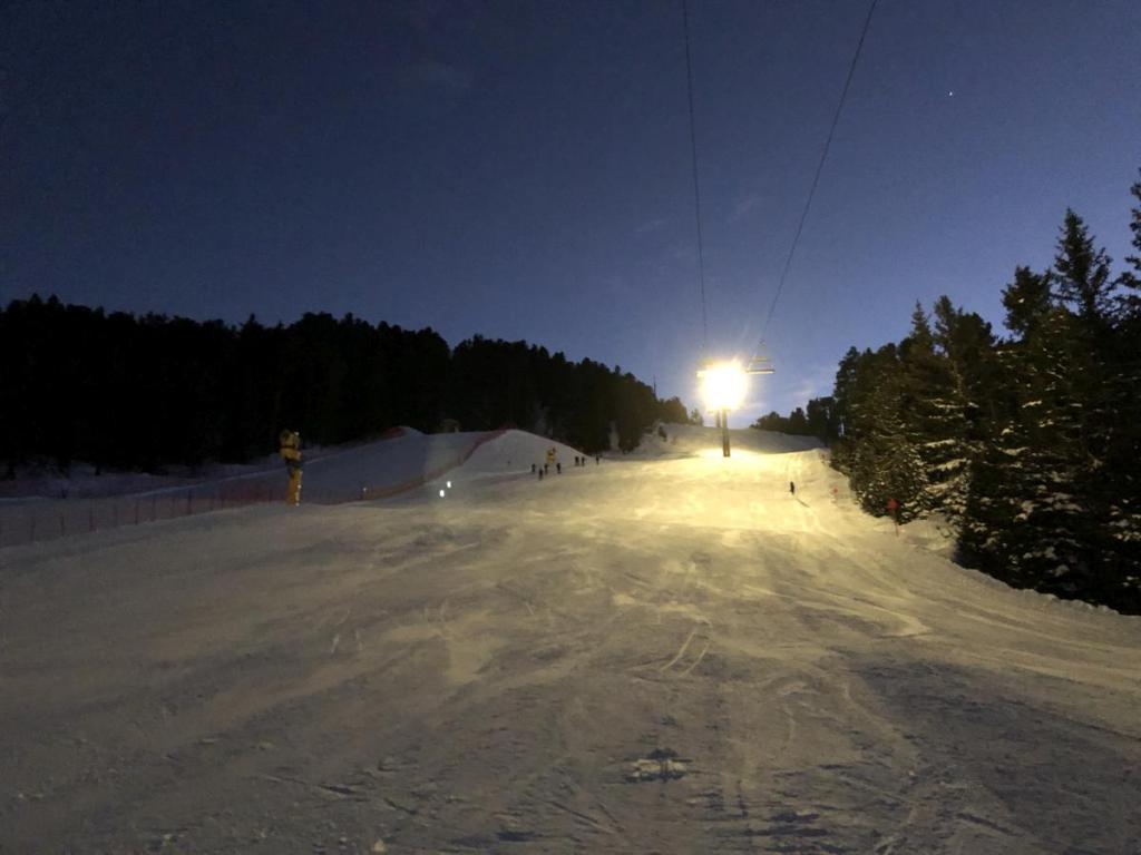 Ich habe den richtigen Zeitpunkt für die Abfahrt gewählt, ich erreiche noch ohne Taschenlampe die Bergstation der Gondel, aber hier ist die Piste teilweise beleuchtet und ich brauche überhaupt keine Lampe.