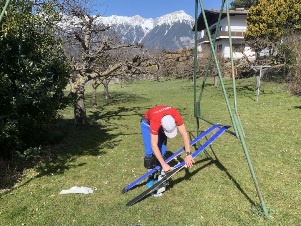 Wir machen die ersten paar Schritte, da bleibt Wolfi stehen… sein Skistecken hat sich in die Einzelteile zerlegt… Gott sei Dank habe ich ein wenig Tape dabei, so wird der Schaden notdürftig behoben. Nun können wir los starten.