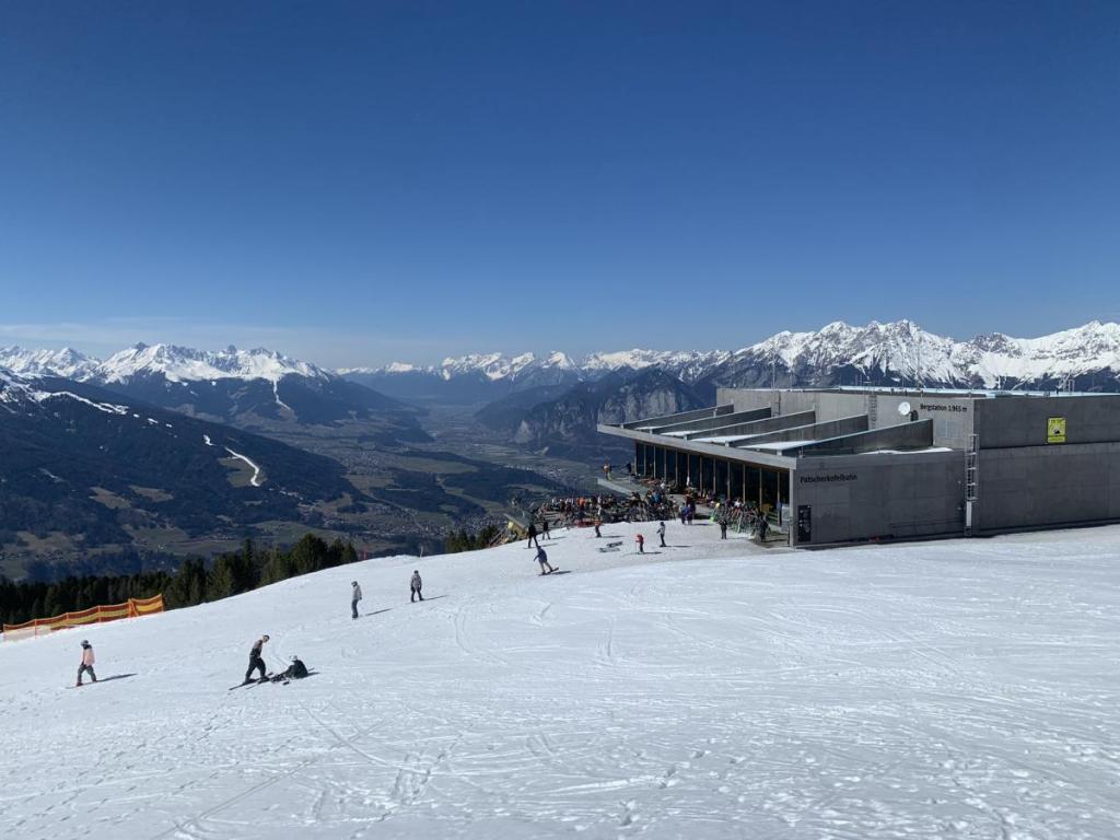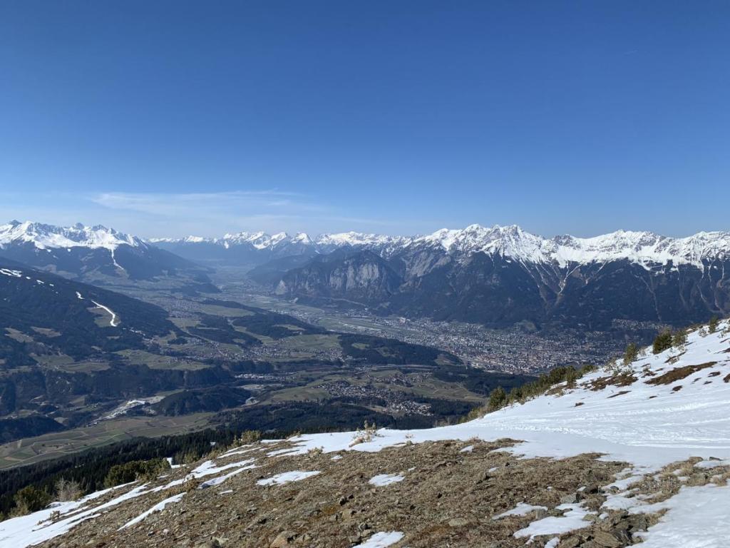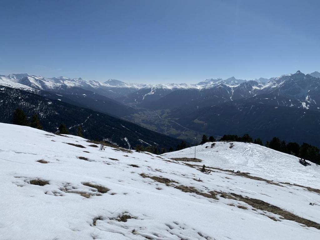Auch ins Wipptal hinauf zum Brenner ist die Sicht wunderschön. Der Schnee hat sich schon sichtbar in die höheren Regionen zurückgezogen, im Tal scheint das Frühjahr unaufhaltsam angekommen zu sein.