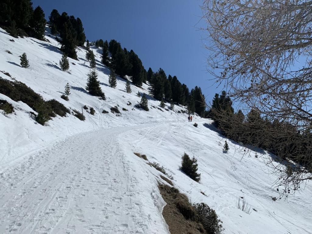 Da wir erst zu Mittag starten, ist der Schnee schon ein wenig batzig, aber gut zu gehen… und die Jacke kann gleich im Rucksack verschwinden.