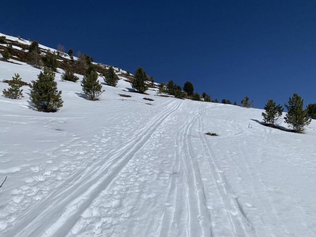 Die Abfahrt über die sanften Hänge ist super angefahren, der Schnee schon recht weich…