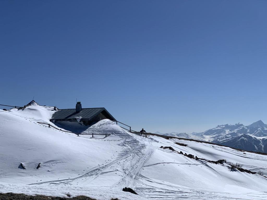 Bei der ehemaligen Bergstation des 1er-Sesselliftes, heute befindet sich hier die Gipfelstube, ziehen wir uns um. Das Gasthäuschen ist heute leider geschlossen, daher fahren wir über den Ziehweg hinunter ins Skigebiet.