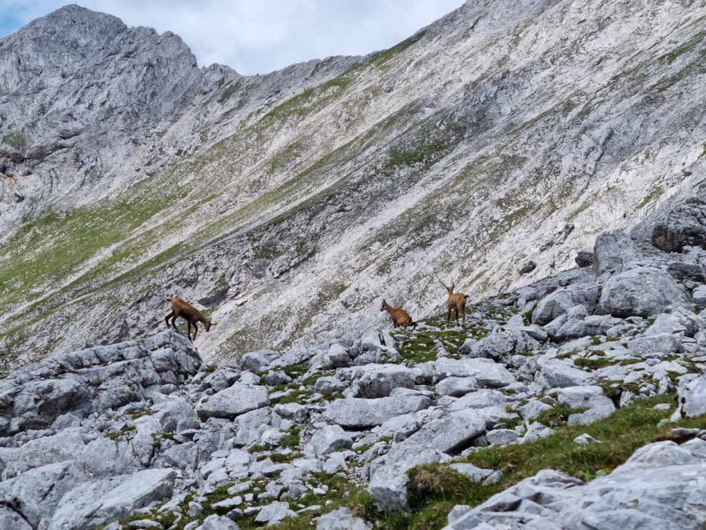 Das Wetter hat aufgerissen, es schaut gar nicht schlecht aus. Den Wilde-Bande-Steig von der Bettelwurfhütte zum Lafatscherjoch (2.081m) geht in angenehmem Auf und Ab durch Schotterfelder und Felsen. Zwischendurch sehen wir immer wieder Gämsen.