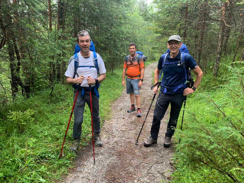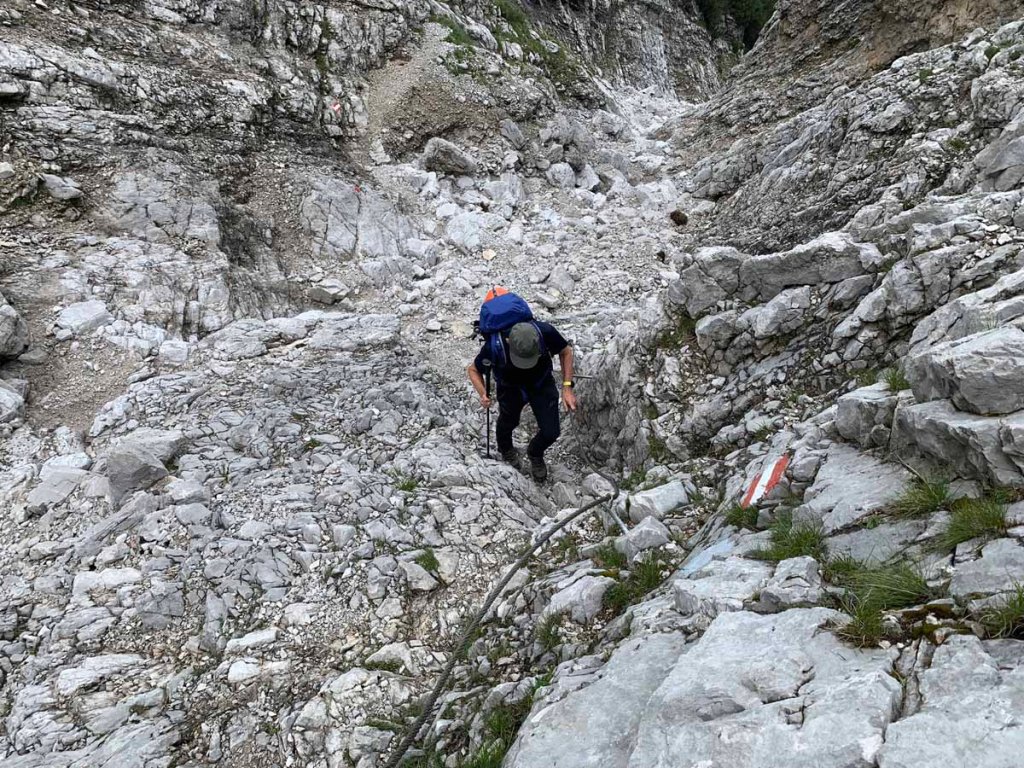 Nach kurzer Beratung, der Fels ist nass, beschließen Maggo und Daniel den Klettersteig zu besuchen, während Papa und ich auf dem Normalweg zur Hütte aufsteigen werden.