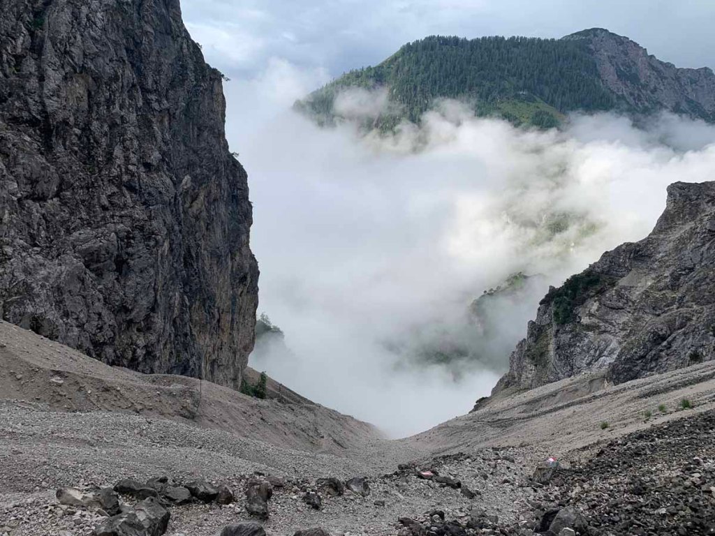 Das Wetter spiel heute alle Stücke, mal reißt die Wolkendecke auf, im nächsten Moment ziehen wieder verrückte Wolken durch das Tal. Der Aufstieg durch Schotterreisen und Latschenfeldern gestaltet sich allerdings so angenehm.