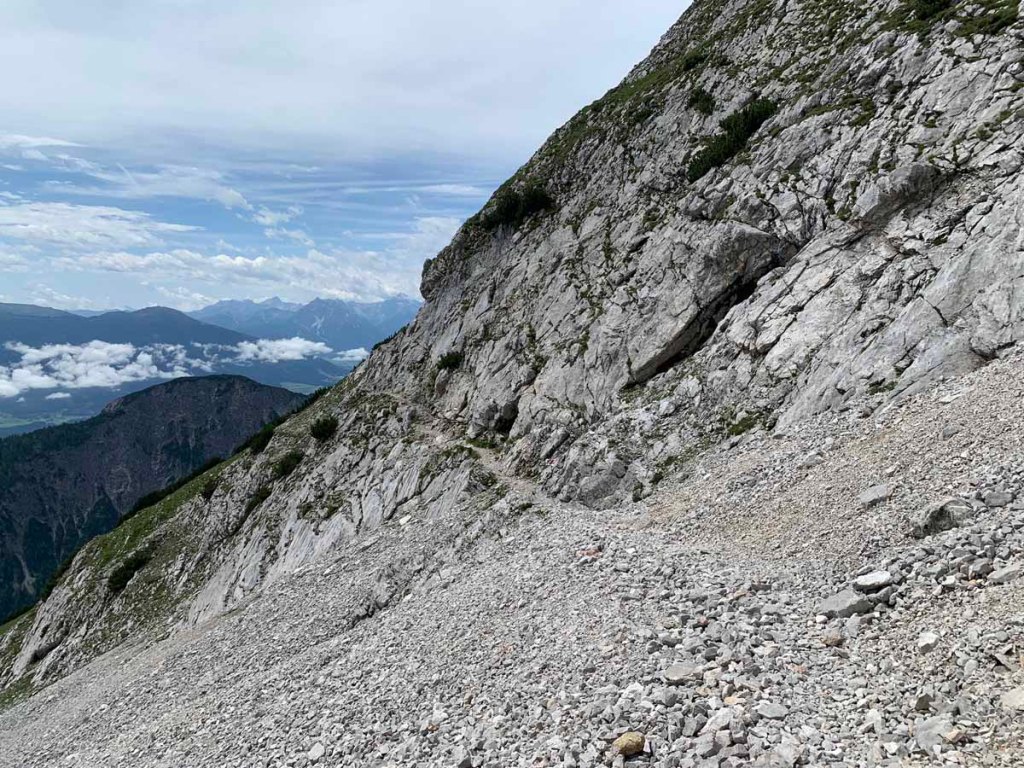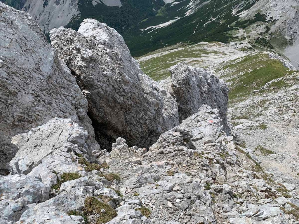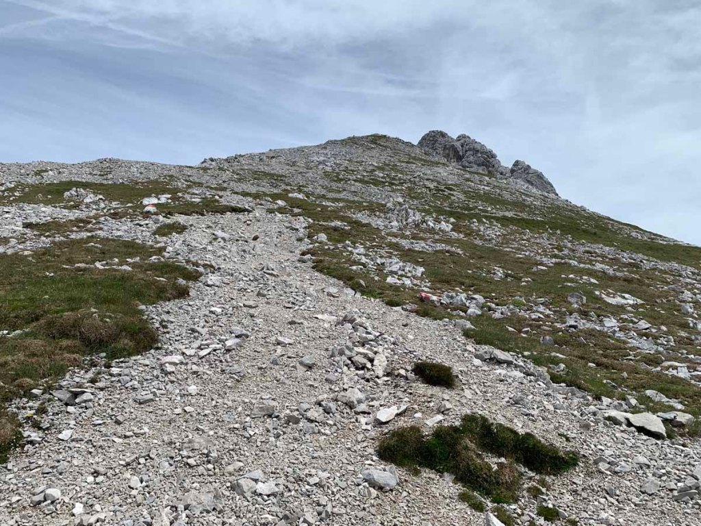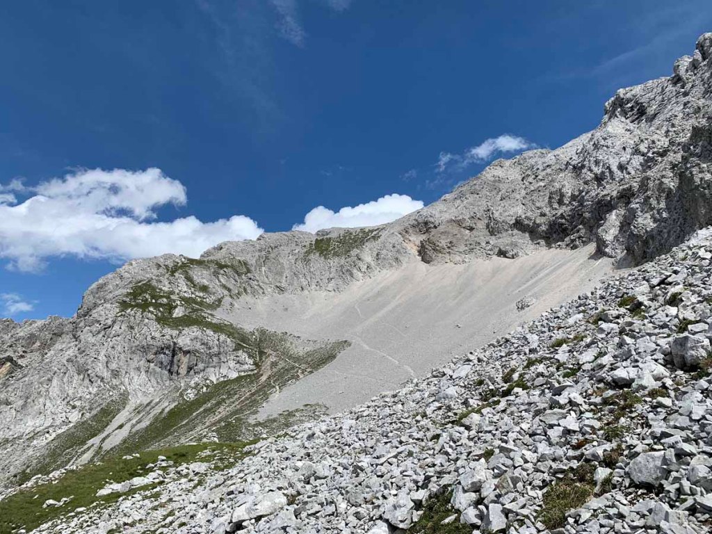 Vom Lafatscherjoch steigen wir mühselig über Schotter in Richtung „Südwestgrat“ auf