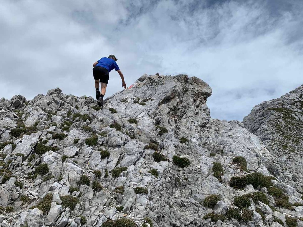Im oberen Teil wird es dann ein wenig spannender, zwei Stellen erfordern den Einsatz der Hände, und 2-3 luftige Gratstellen müssen gemeistert werden.