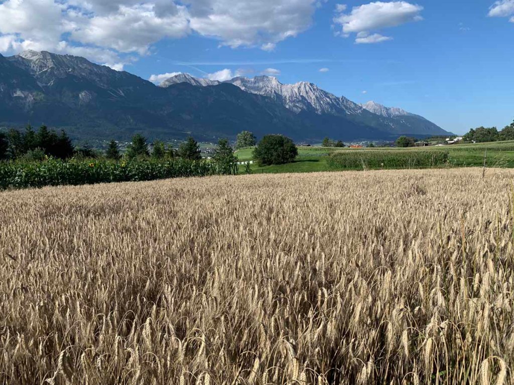 Nach kurzer Zeit erreiche ich die Aldranser Felder, der Weizen steht in voller Blüte. Teilweise wurden die Halme durch den Sturm niedergedrückt, aber der Großteil der Ernte ist wohl erstmals gerettet.