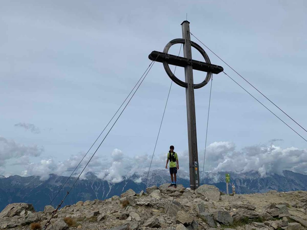 Eine kurze Pause am Gipfel muss sein, dann steigen wir über den Osthang wieder runter Richtung Zirbenweg.
