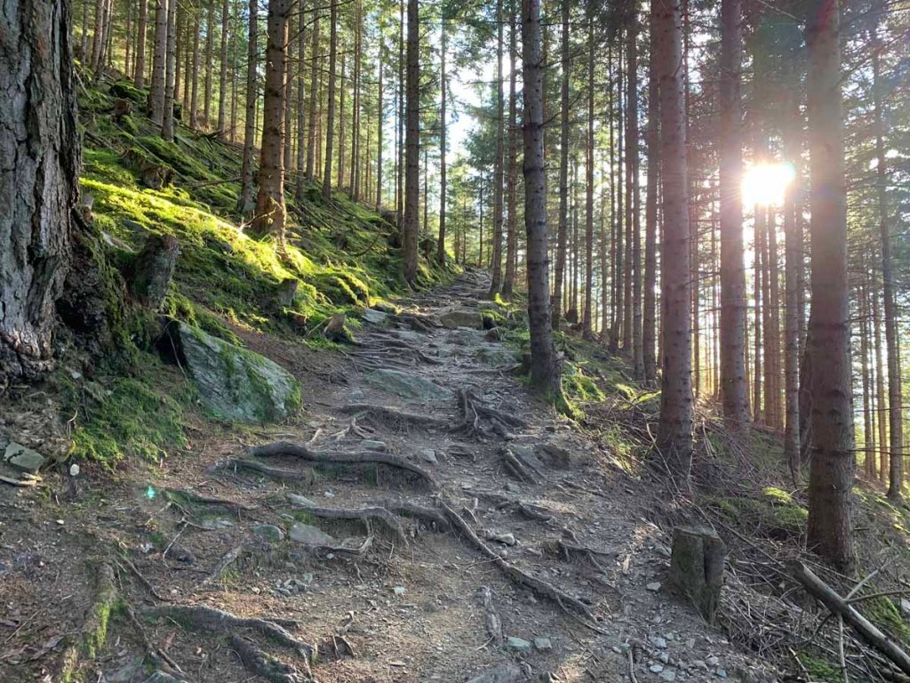 Über Stock, Stein und Wurzeln wandern wir durch den kühlen Wald relativ direkt hinauf zur Alm.