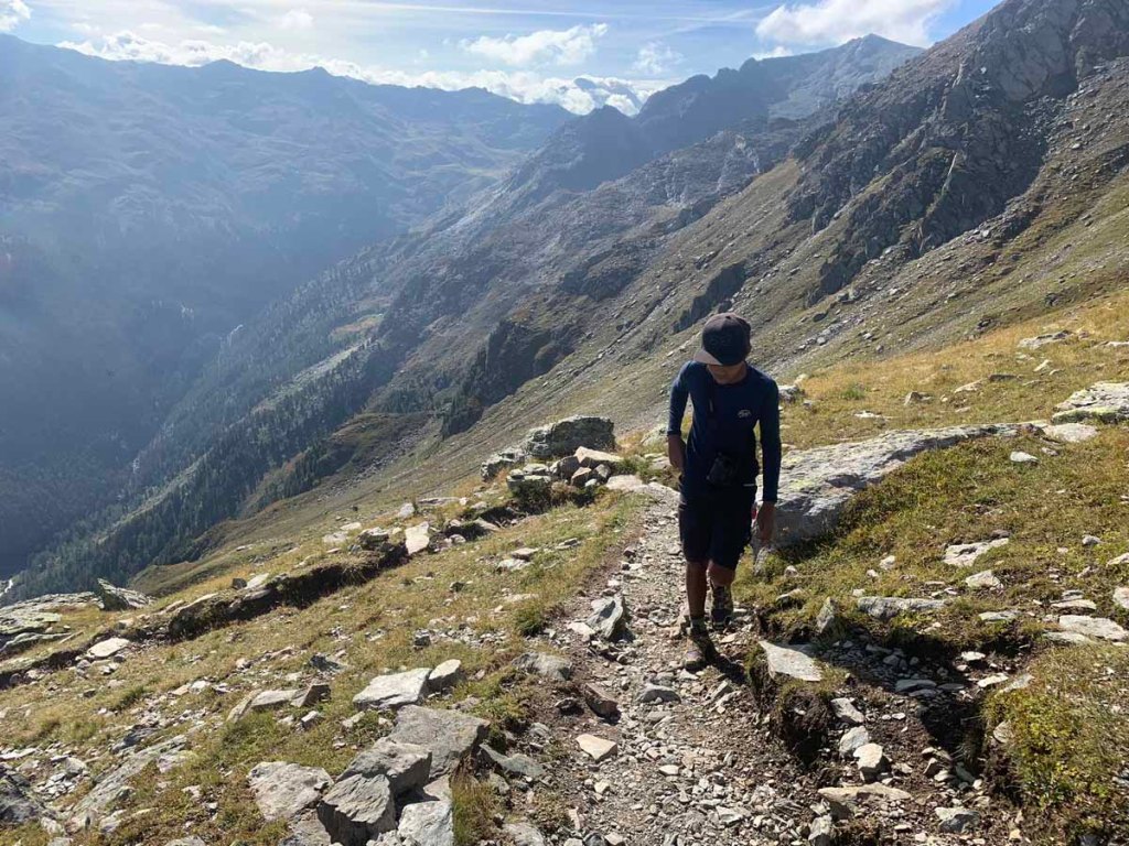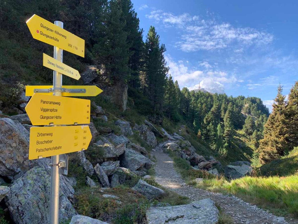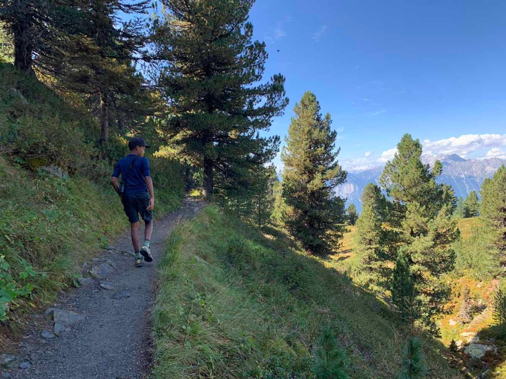 Von der Viggarspitze sind wir auf den Zirbenweg gekreuzt, diesem folgen wir nun bis nach Boscheben. Der Wind hat nun merklich aufgefrischt, Föhn ist angesagt.