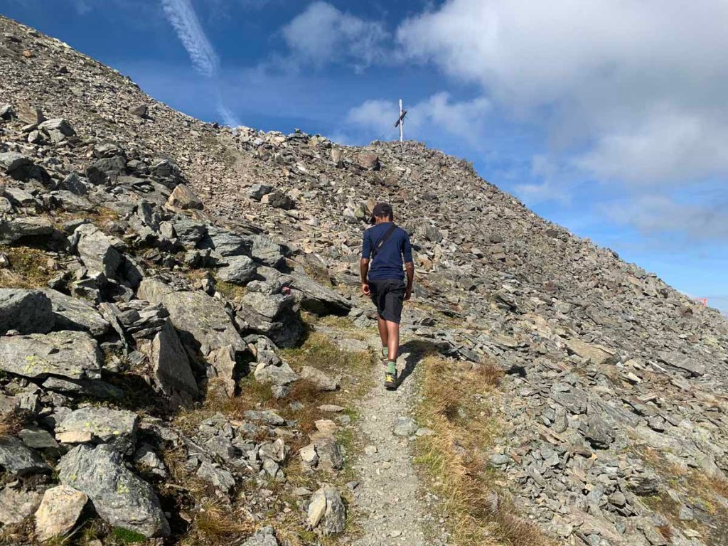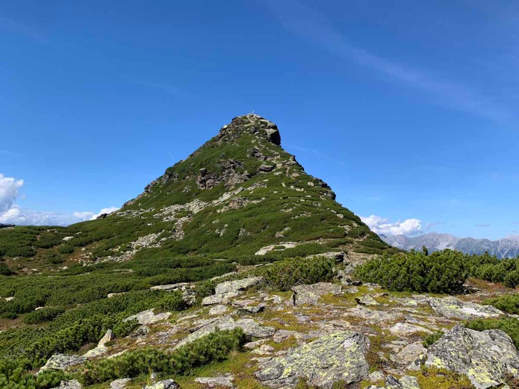 Über dichte Heidelbeer- und Almrosenstauden kommen wir unserem ersten Ziel immer näher. Noch eine Kurve, wie es so schön heißt, dann stehen wir am Schartenkogel (2.311m).