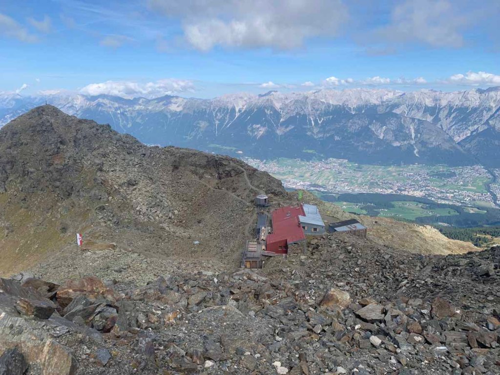 Wir wandern an der perfekt in den Fels geduckten Glungezerhütte (2.610m) vorbei, für eine Einkehr ist es aber noch zu früh.