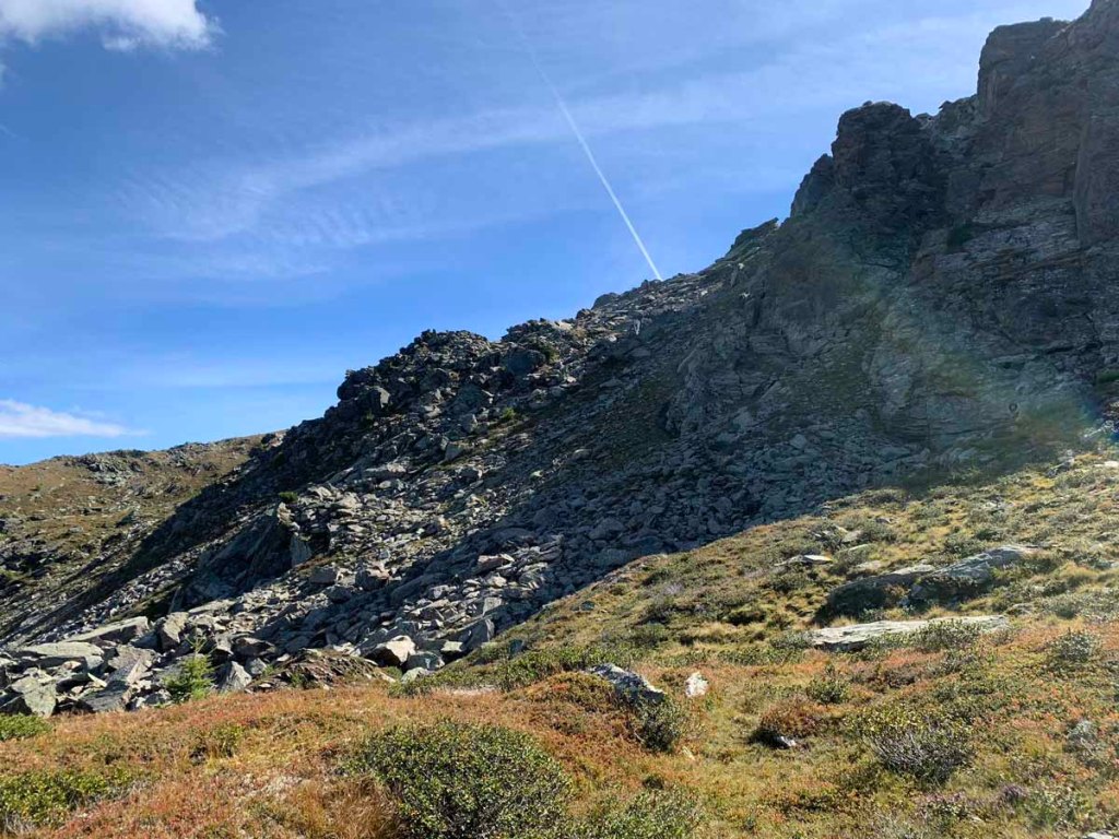 Unser nächstes Ziel haben wir schon im Sichtfeld, die Viggarspitze (2.306m). Zuerst müssen wir auf der Westflanke ins kleine Tal zwischen den Spitzen absteigen…