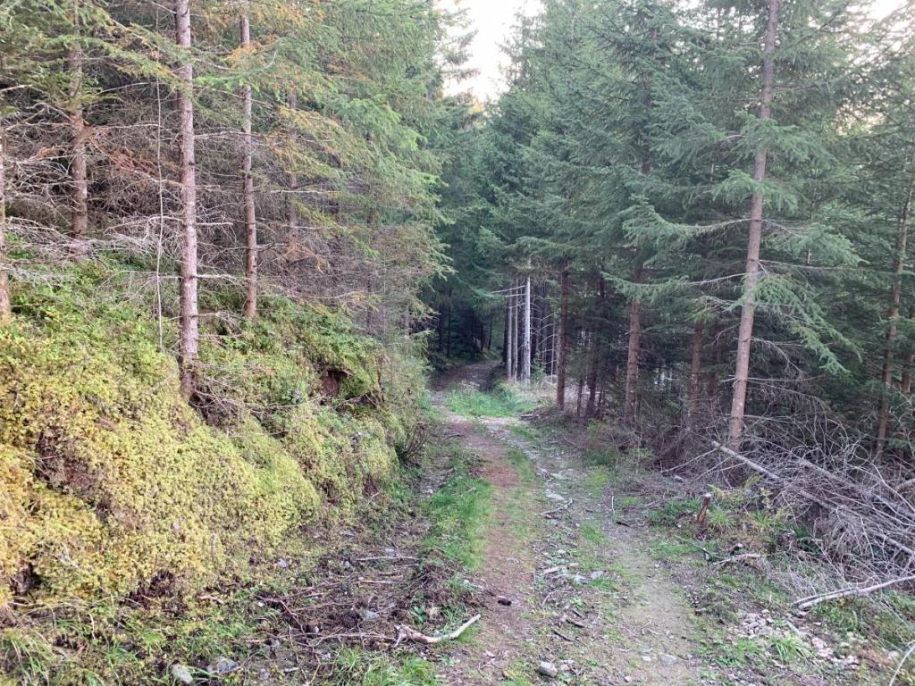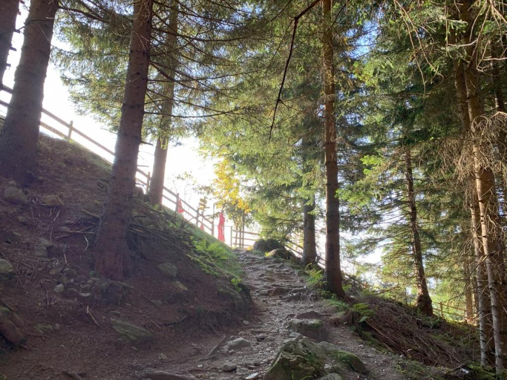 Erst steige ich über den steilen Waldsteig ganz in der Nähe der Alm ab. Dieser wird den Spuren nach zu urteilen auch öfter von Downhillern benutzt.