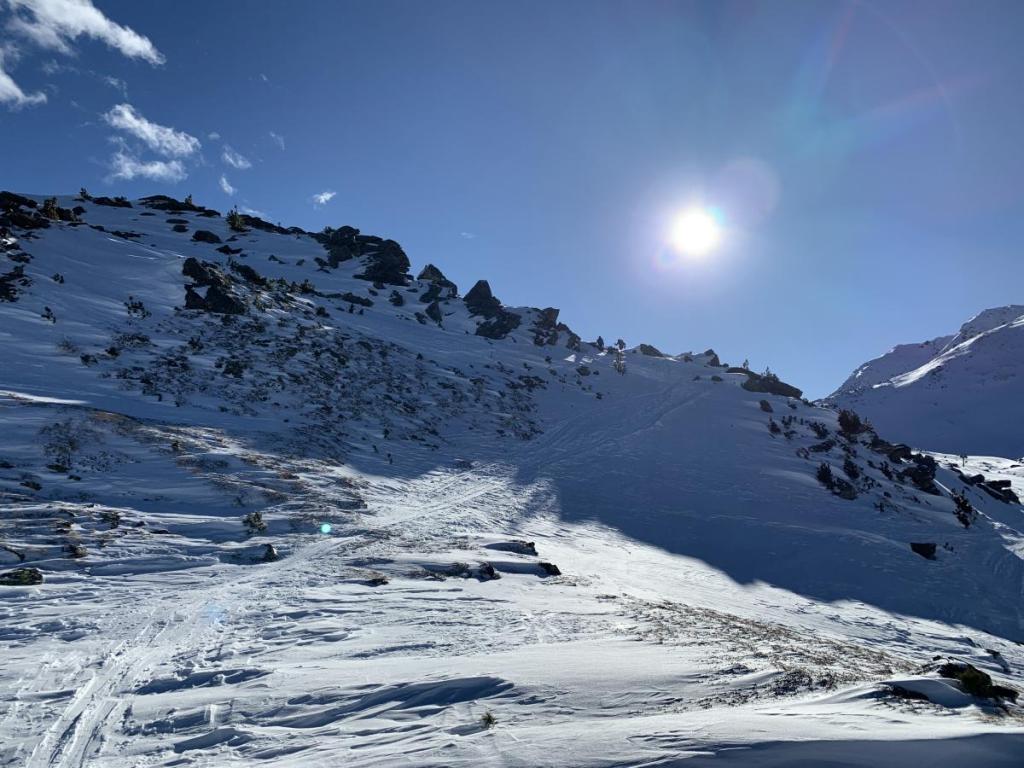 Sobald wir im Gelände sind, hat man gefühlsmäßig das Skigebiet vergessen. Es macht trotz mangelhafter Schneedecke richtig Spaß, bei diesem Kaiserwetter in den Bergen unterwegs zu sein.