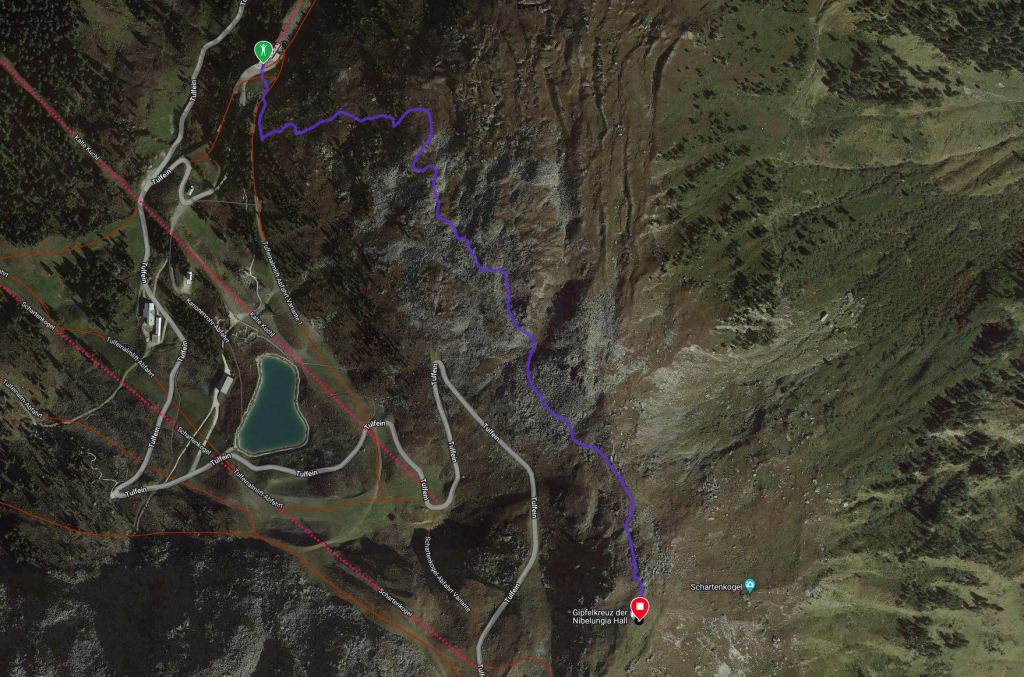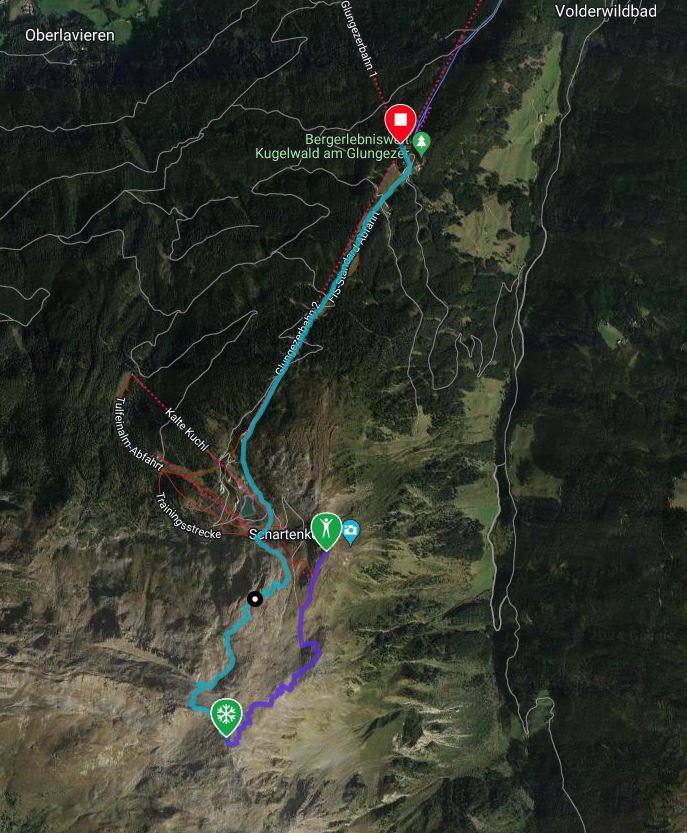 Wir fahren vom Gipfelkreuz die paar Meter hinunter zur Glungezerhütte, hier wollen wir uns eine verdiente Einkehr gönnen. Aus dem Weg zur Hütte sehen wir auch den Verlauf der Route Roman… wir erinnern uns.