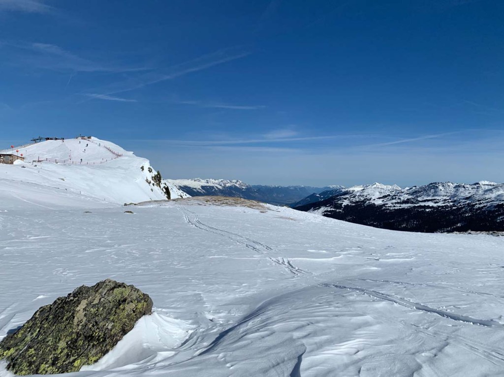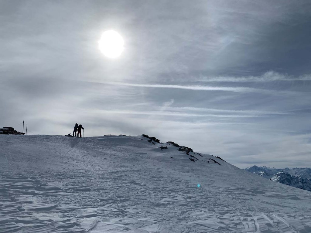 Ein letzter Blick gilt noch in Richtung Kreuzspitze, die ich letztes Jahr im Sommer besucht hatte. Dann fahren wir über die pistenähnlich abgefahrenen Hänge hinterunter ins Skigebiet und weiter zur Mittelstation.