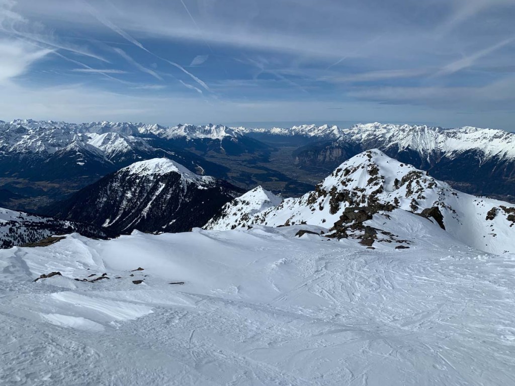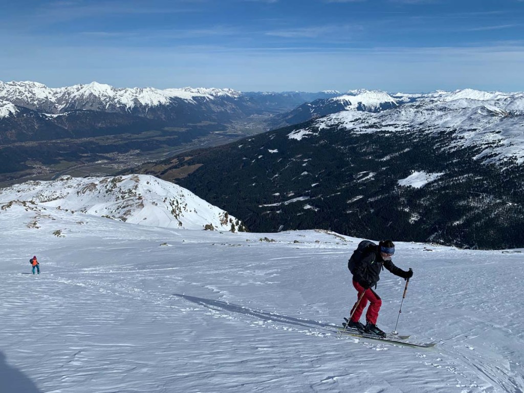 Es ist eine schöne Spur angelegt, im Hintergrund sehen wir schon unser Hauptziel, den Gipfel des Glungezers. Bis dorthin müssen wir aber noch ein paar Meter machen…