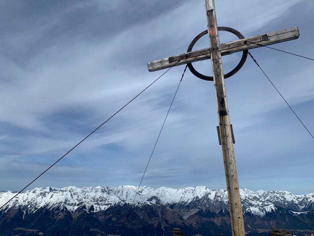 Wir sehen unterhalb vom Gipfelhang schon das Gipfelkreuz vom Glungezer, nun haben wir es bald geschafft.
