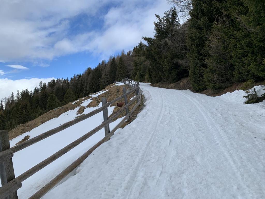 Ich erreiche nach ein paar Minuten die Patscher Alm (1.694m), hier verlasse ich das Skibgebiet und folge dem Forstweg, auch Vitalweg genannt, in Richtung Hochmahdalm