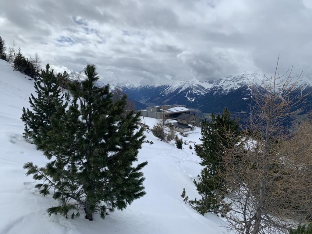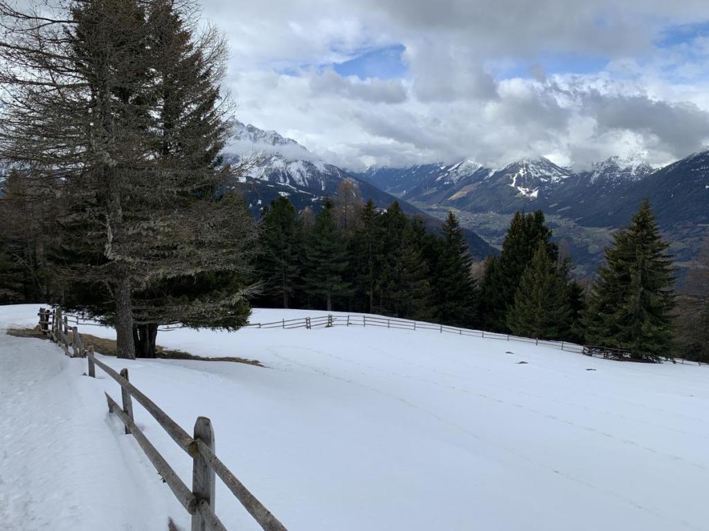 Mit der Bahn fahre ich bis zur Mittelstation, die Talabfahrt ist schon wegen Schneemangels geschlossen. Hier starte ich, mit Grödeln bewaffnet, die Schneeschuhe bleiben auf dem Rucksack.