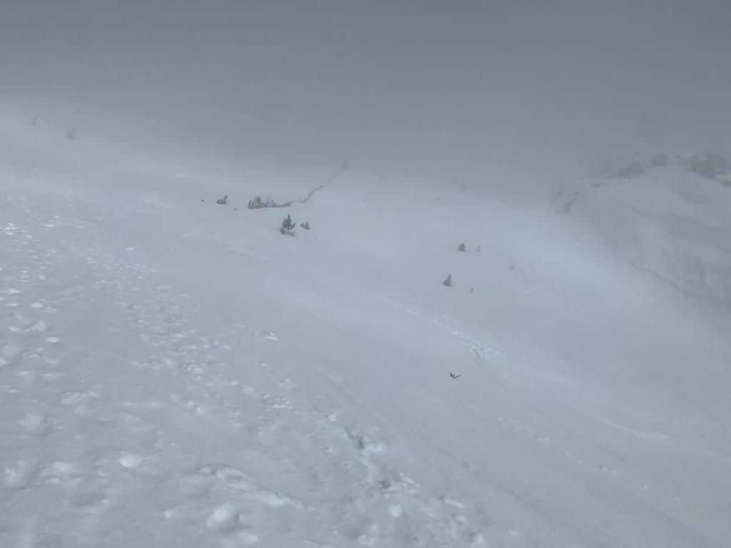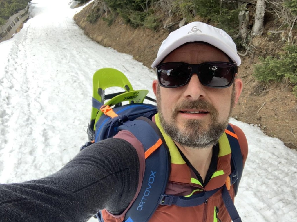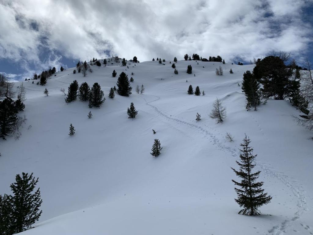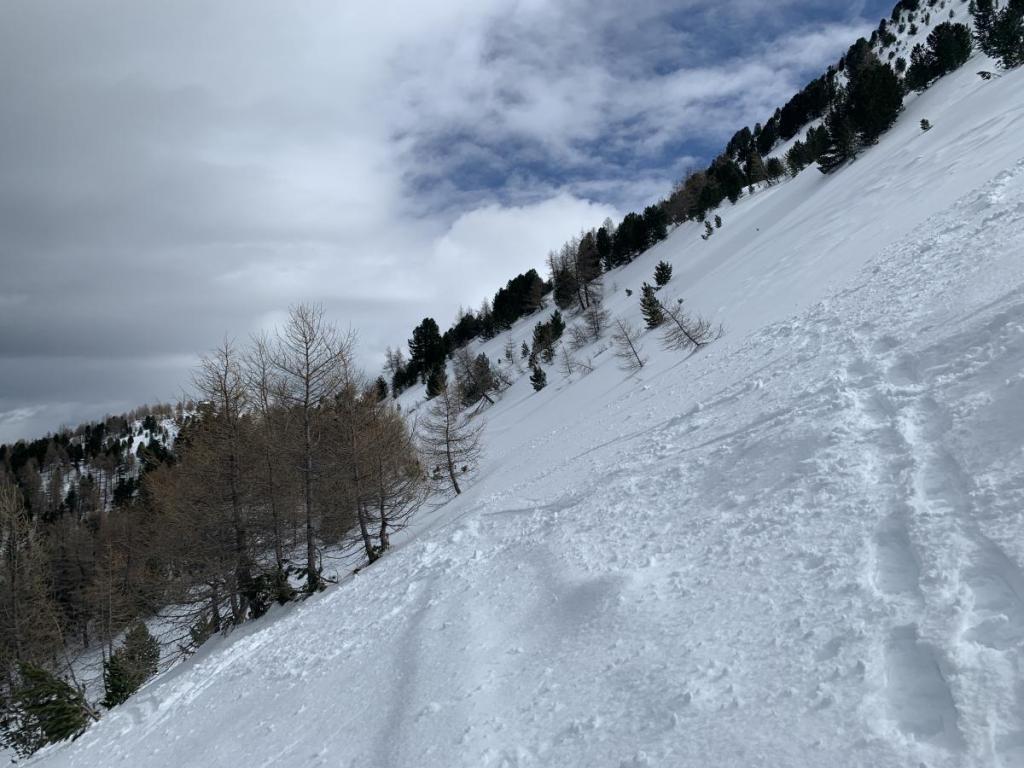 Zusätzlich ist die Schneeschichtung gelinde gesagt „komisch“, oberflächlich liegt ein fast schon schmieriger Schneefilm, unterhalb eine sehr harte Schneeschicht. Dies beeinflusst den Gripp der Schneeschuhe, ansonsten kein Thema, heute ein wenig negativ!