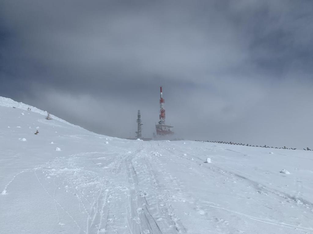 Ich stapfe vor mich her, Sicht gegen Null, als plötzlich die Wolkendecke aufreißt und die Sendeanlage direkt vor mir liegt. Ich bin überrascht, dass ich schon fast auf dem Gipfel stehe.