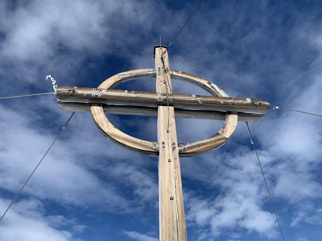 Ein Abstecher zum Gipfelkreuz des Patscherkofels ist Pflicht. Der Wind bläst wie verrückt, daher bleibe ich nur einen Augenblick stehen.