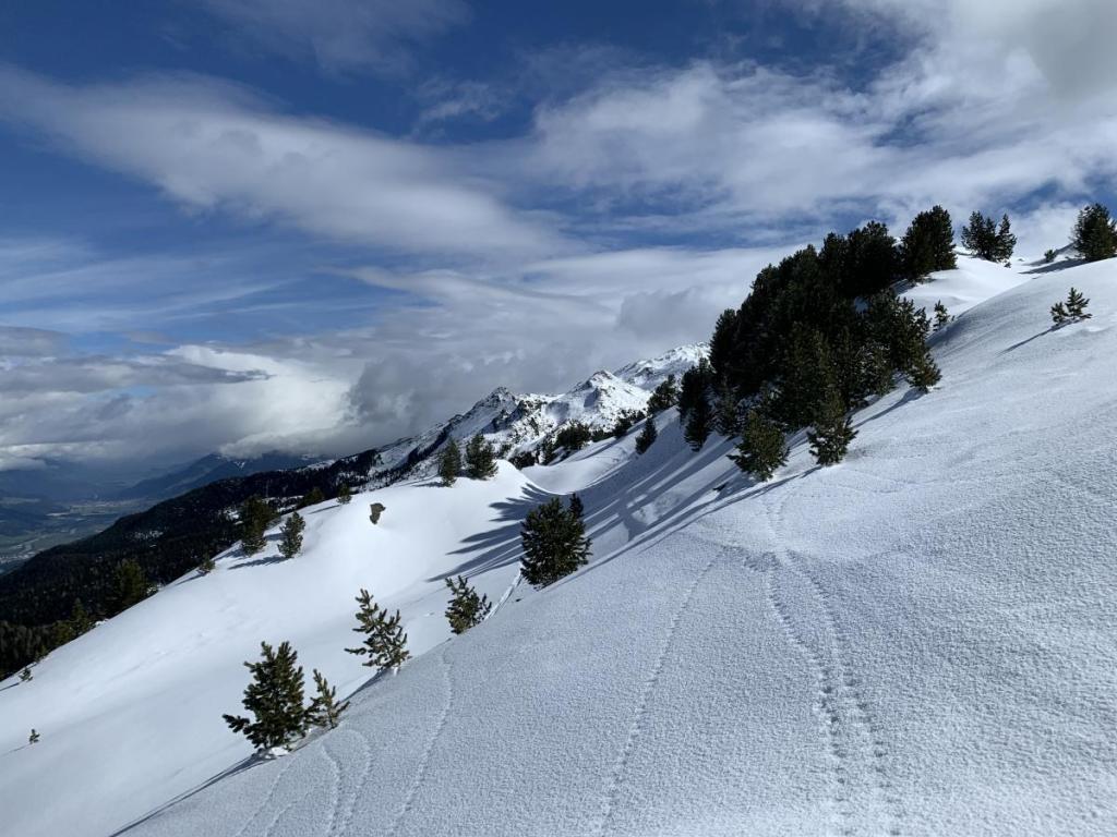 Von der Hütte führt eine Spur in Richtung Patscherkofel-Bergstation, undeutlich, aber erkennbar. Dieser folge ich, vermutend, dass ich auf dem Zirbenweg bin. Dies dürfte auch der Fall sein, allerdings ist der Weg zugeschneit und relativ steil, mit den Schneeschuhen stellt diese eine Herausforderung dar.