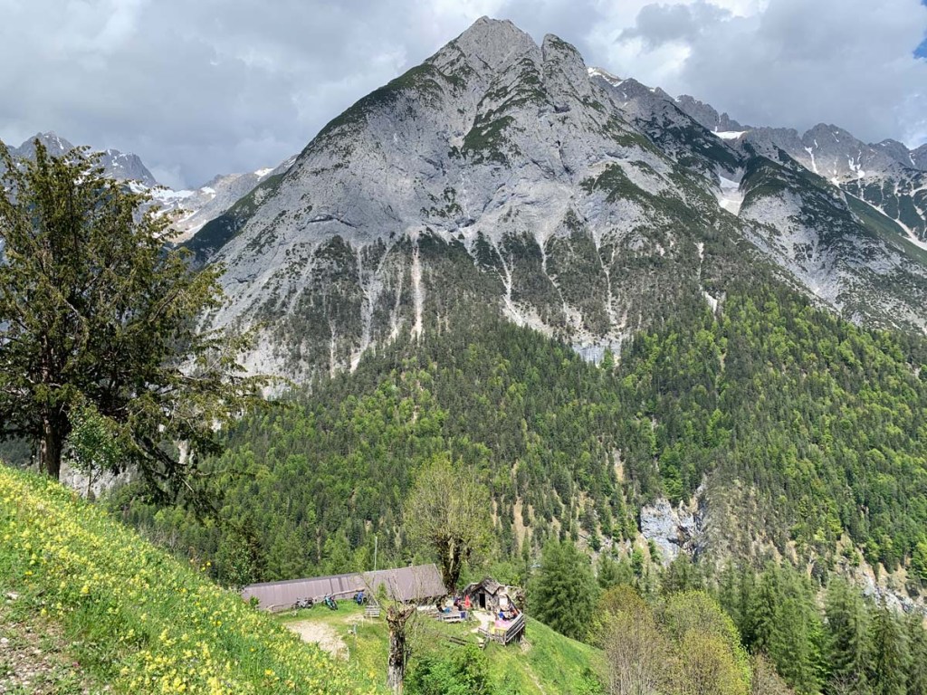 Wir erreichen den Wendepunkt, in einer „Fast-180-Grad“-Kurfe dreht der Weg nun gen Westen, hinein in das Vomper Loch. Vor uns, prominent, liegt nun die Huderbankspitze, einer der schwierigeren Karwendelberge.