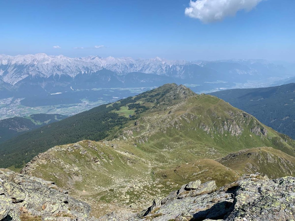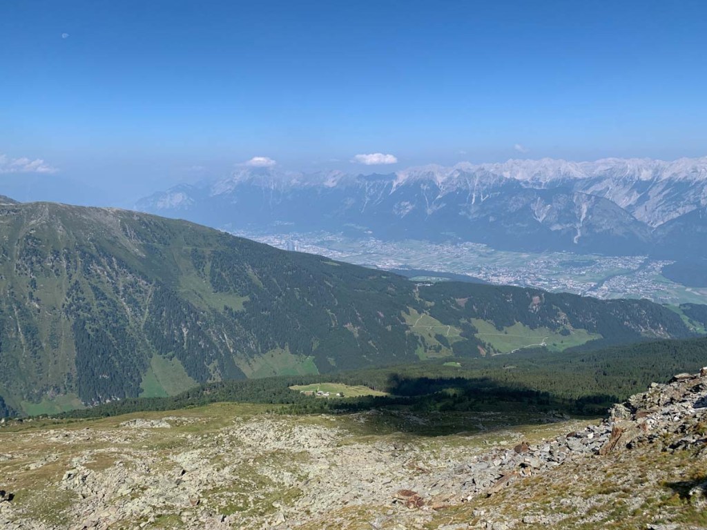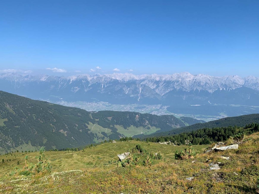 Den Wald haben wir nun hinter uns gelassen, die Aussicht auf das Inntal ist wie gewohnt wunderschön, die Fernsicht heute ein Traum.