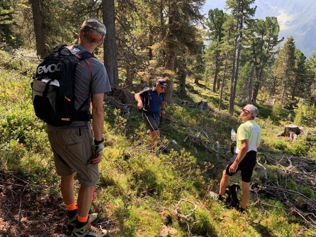 Ein wenig abseits der Alm stellen wir unsere Räder in den Wald, nun müssen wir per Pedes weiter gehen. Der Erste ist gleich der abenteuerlichste Teil unserer Tour, weglos führt uns Wolfi durch den Zirbenwald, bis wir, fast ein wenig erleichtert, den Steig auf den Haneburger finden.