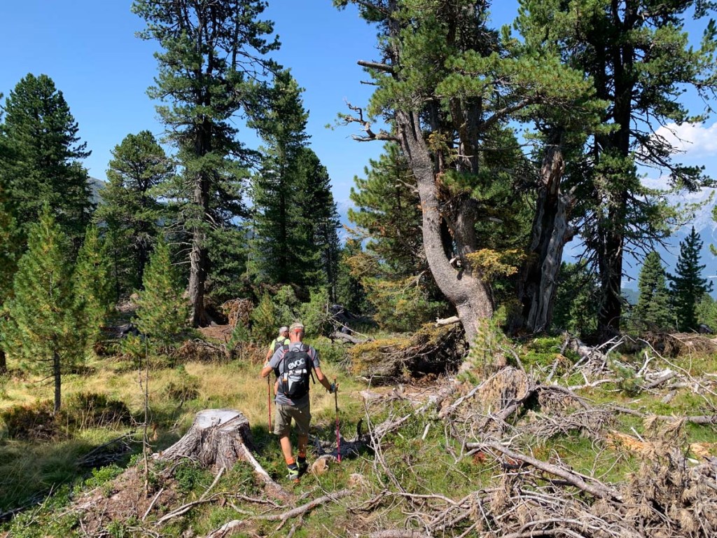 Vorbei an uralten Zirben, manche mögen ein paar Jahrhunderte alt sein, suchen wir unseren Weg.