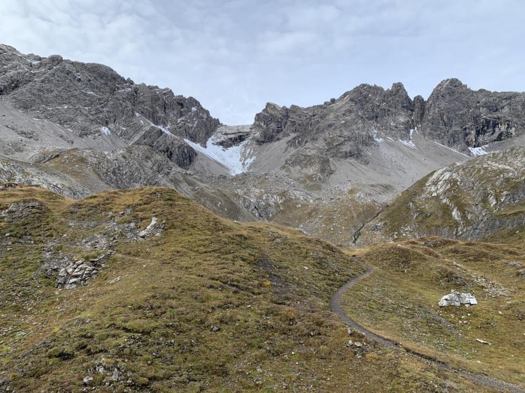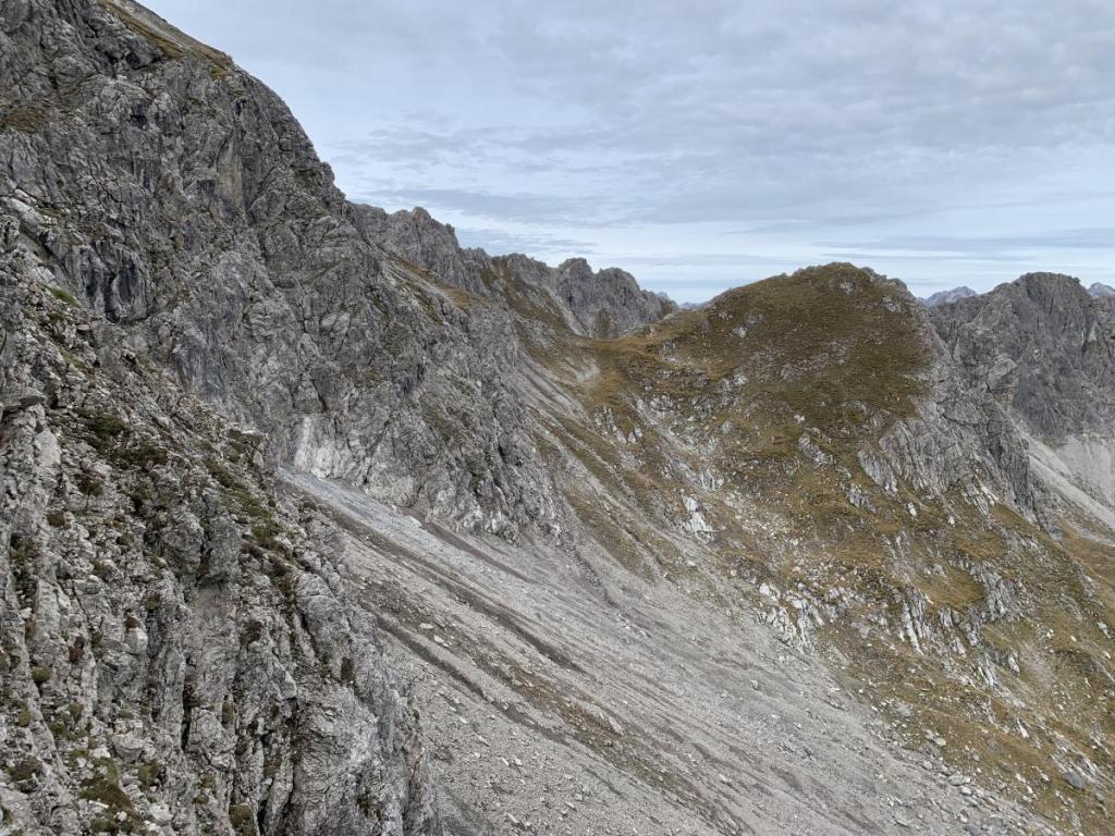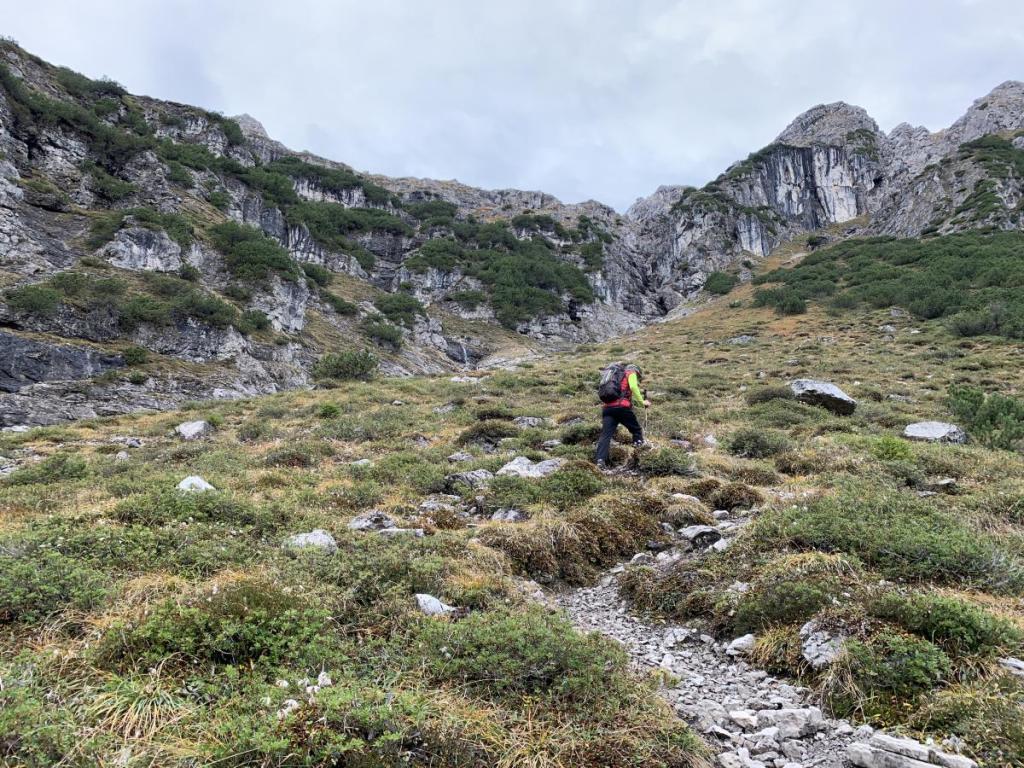 Unser weiterer Weg führt uns oberhalb der „Oberen Petschinger Böden“, unter der Großen Schafkarspitze auf teilweise ungutem Wege auf den Rücken des Hirschhals.