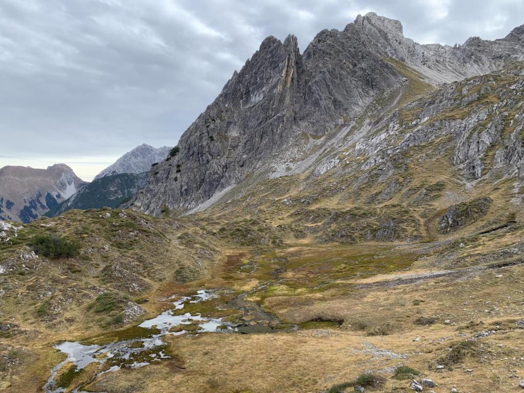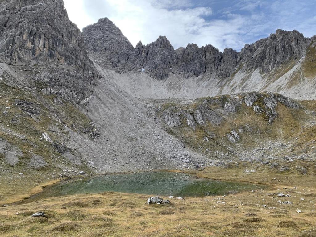 Wir müssen die Felsen immer wieder umgehen, aber schlußendlich kommen wir auf der oberen Ebene an, vor uns liegt ein wohl ehemaliger See, der sich nun in ein Moor-ähnliches Gebilde verwandelt hat. Im Hintergrund sehen wir die zerklüftete Grüntalspitze.