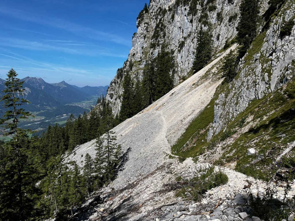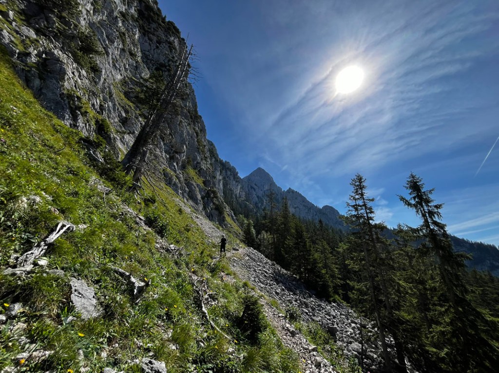 Über große Schotterreisen und vorbei an kompakten Felswänden wandern wir fast eben in Richtung Pilgerschorfen. Über uns thronen die 12 Apostel, so ist der zackige Grat zwischen Pilgerschrofen und Säuling genannt.