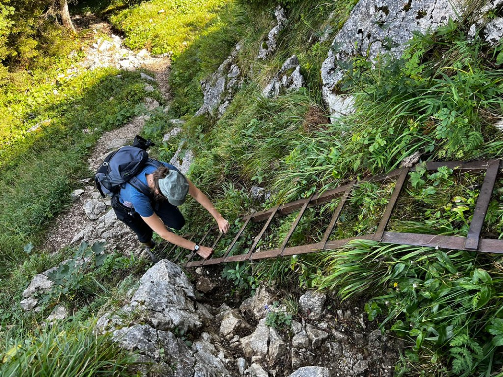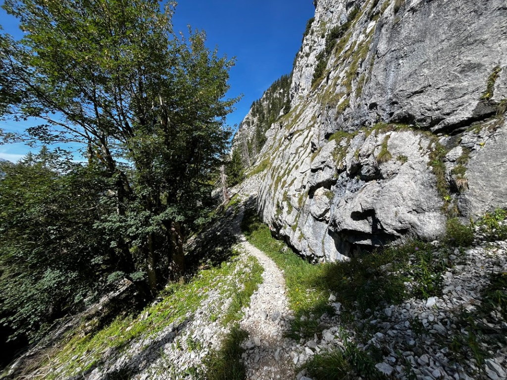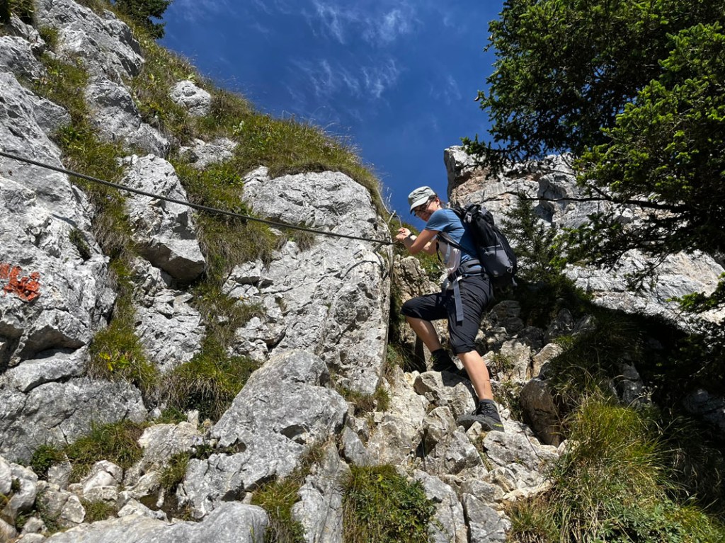 Ein paar Stellen sind seilversichert, generell ist die Südseite häufiger begangen und auch speckiger. Dennoch ist der Weg gut zu begehen und rasch erreichen wir wieder den schönen Boden vor dem Säulinghaus.