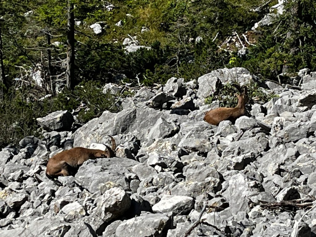 Auf den Schotterreisen haben wir Glück, Steinböcke haben sich zu einem Stelldichein versammelt. Sie ignorieren uns gekonnt, man könnte fast meinen, wir Wanderer sind ihnen egal.