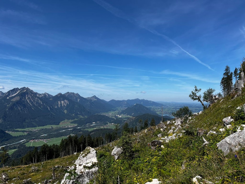 Im Westteil des Säulings war vor einigen Jahren ein großer Kahlschlag des Bergwaldes, nun hat man eine tolle Aussicht auf den Talkessel und den Eingang zum Lechtal.