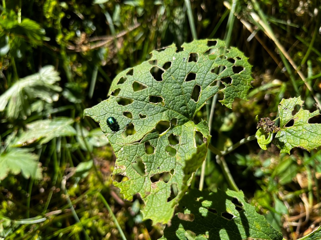 Am Wegesrand gibt es viel zu bestaunen, wie zum Beispiel den grün-metallischen Käfer, der regelmäßige Löcher in ein Pestwurzblatt stanzt. Nun wandern wir flach und teils abwärts auf Deutschem Staatsgrund.