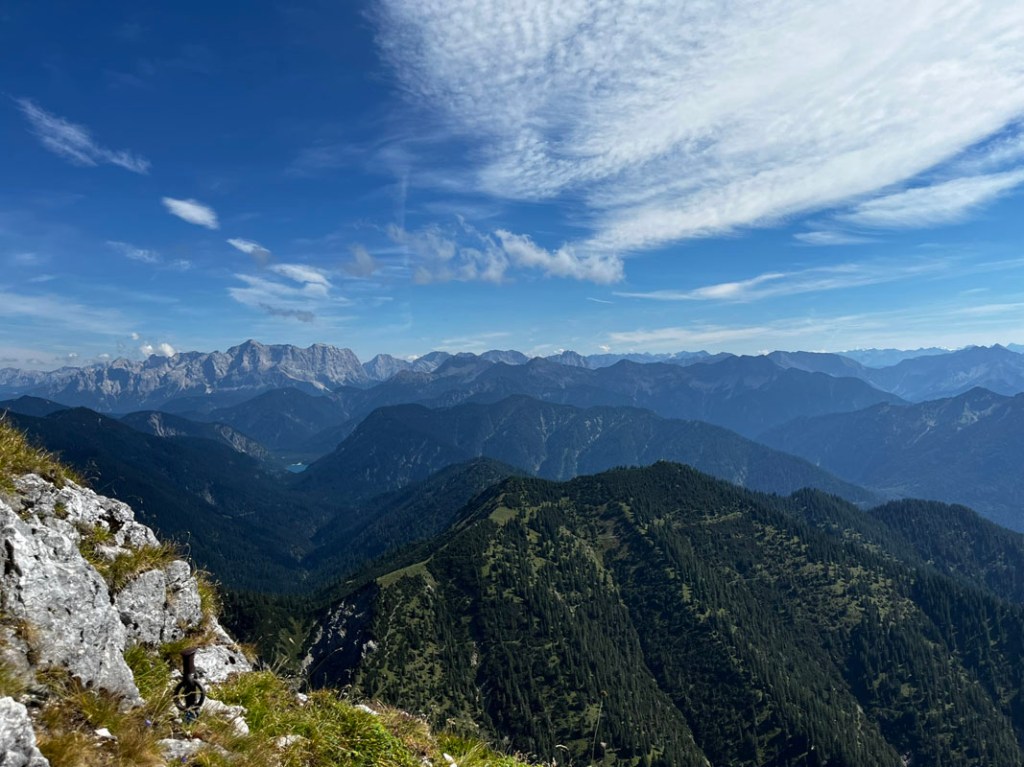 In den Osten geblickt sehen wir den massiven Bergstock des Wettersteins mit der dominierenden Zugspitze, vor uns liegt das Koflerjoch, dahinter die Soldatenköpfe und ein Teil des Plansees, bei der „Forelle“. Morgen wollen wir dort stehen…