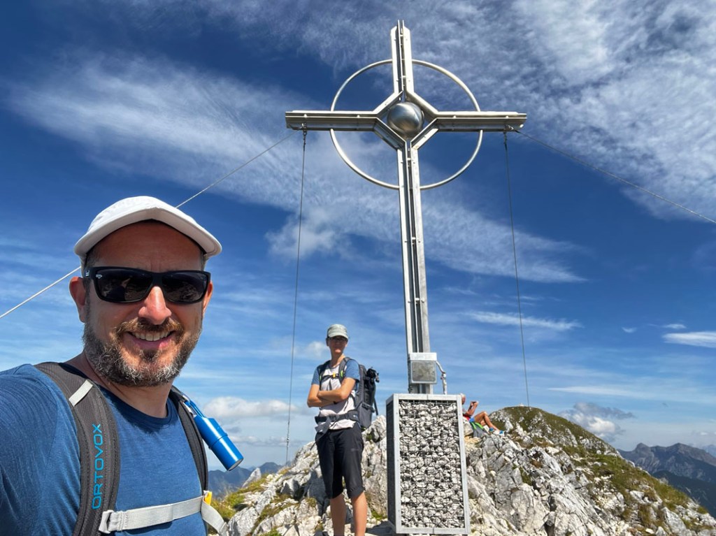 Das letzte Stück ist nochmals ein wenig felsiger, schließlich erreichen wir den Gipfel des Säulings (2.048m). Das neue Gipfelkreuz, von meinem Cousin gezeichnet, strahlt uns schon entgegen. Ein würdiger Ersatz für das ehemalige Holzkreuz.