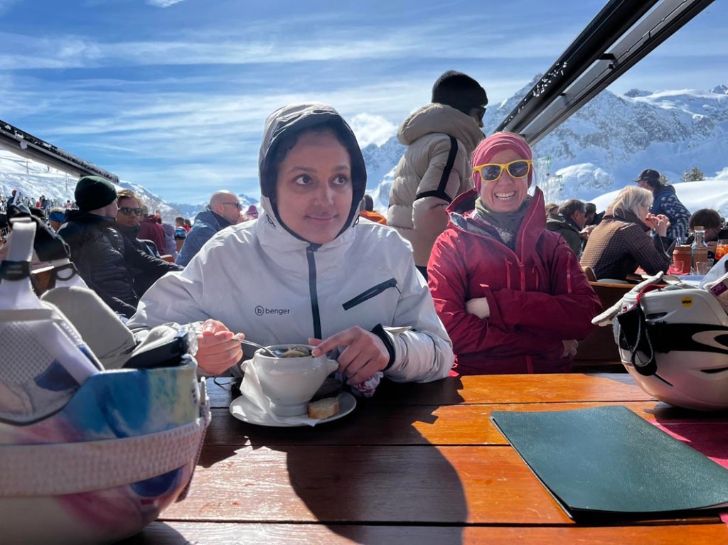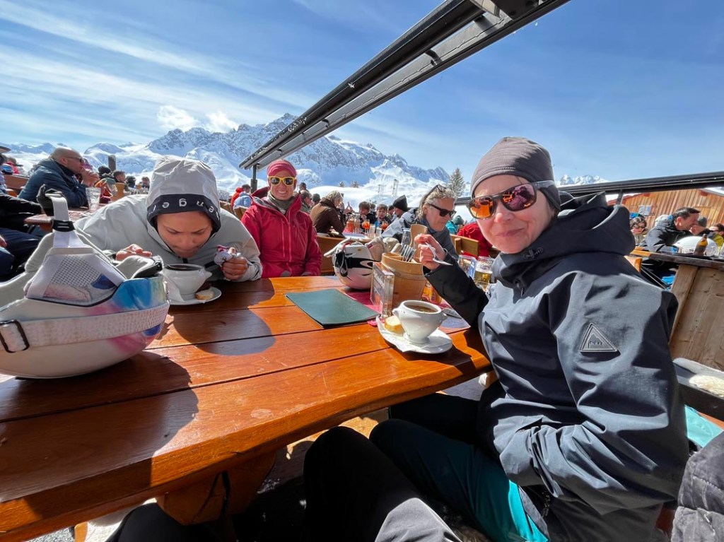 Von dort fahren wir mit dem Lift hinauf zur Tritt-Alm, dort gönnen wir uns ein gutes, aber lautes und teures Mittagessen.