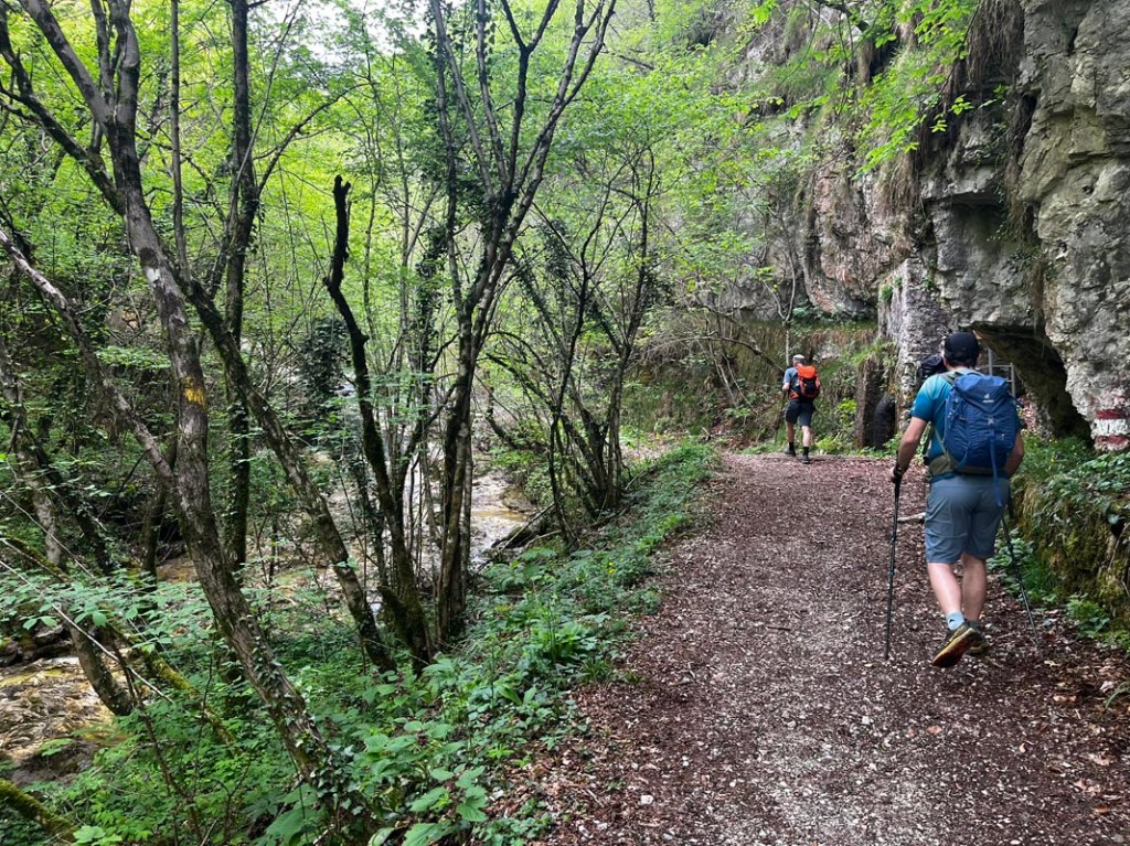 Vom Ende der Straße startet ein schöner Pfad weiter ins wilde Tal hinein. Bald schon müssen wir eine Brücke überqueren. Die Temperatur ist recht hoch.