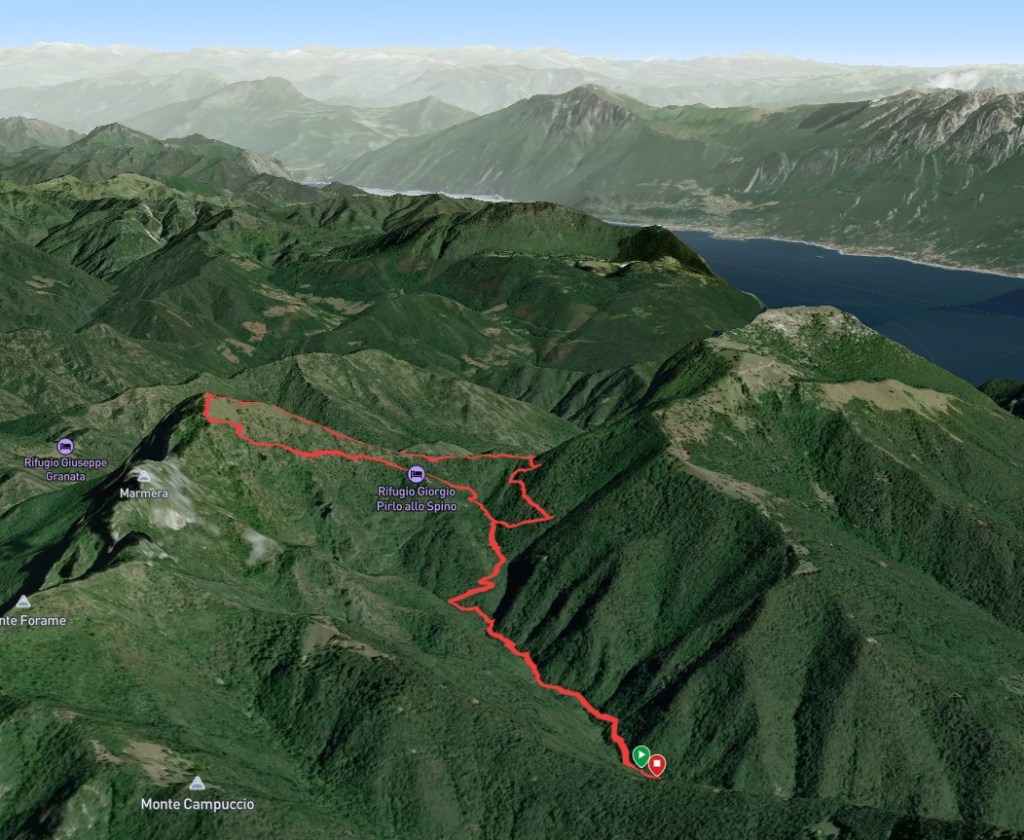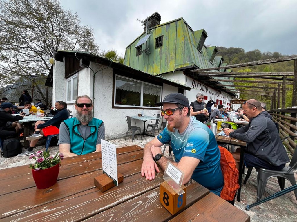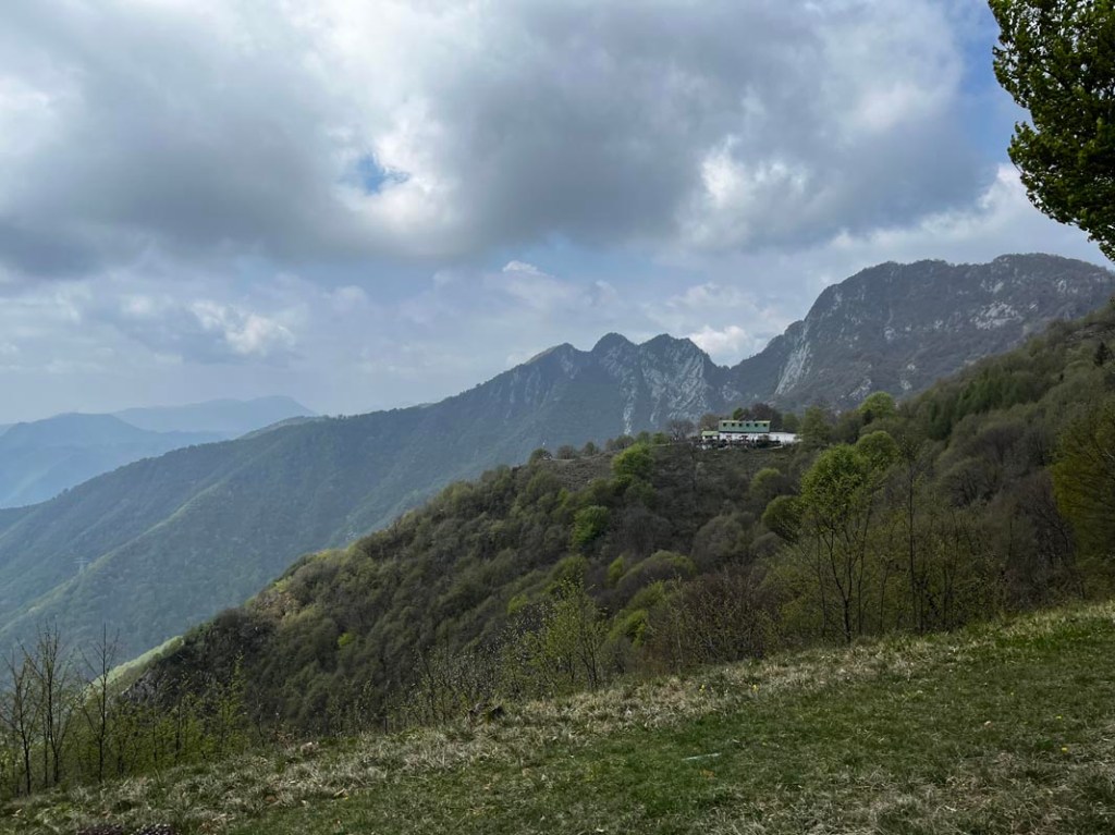 Vor uns entdecken wir nun das „Refugio Pirlo allo Spino“ auf einem Bergrücken. Dort werden wir nach der Tour wohl noch einkehren, wenn das Wetter mitspielt.