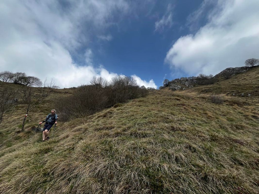 Nun geht´s über steile Bergwiesen ein Stück Richtung Tal, ein Weg ist vorhanden, aber nicht immer gut sichtbar. Wir suchen eine windstille Stelle…