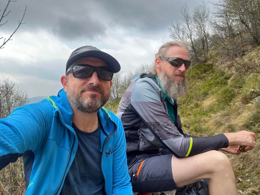 Zu unserer Überraschung ist dort auch eine wasserdichte Tonne mit einer „Mocca“, Kaffee, Kaffeeservice, Gaskocher und sogar einem Grappa angebunden. Ein Zettel informiert, dass man sich hier gerne bedienen kann und dann ein Bild schicken soll. Wegen der frischen Temperaturen verzichten wir auf diesen tollen Genuss. Viel länger als für ein Gipfelfoto bleiben wir nicht hier…