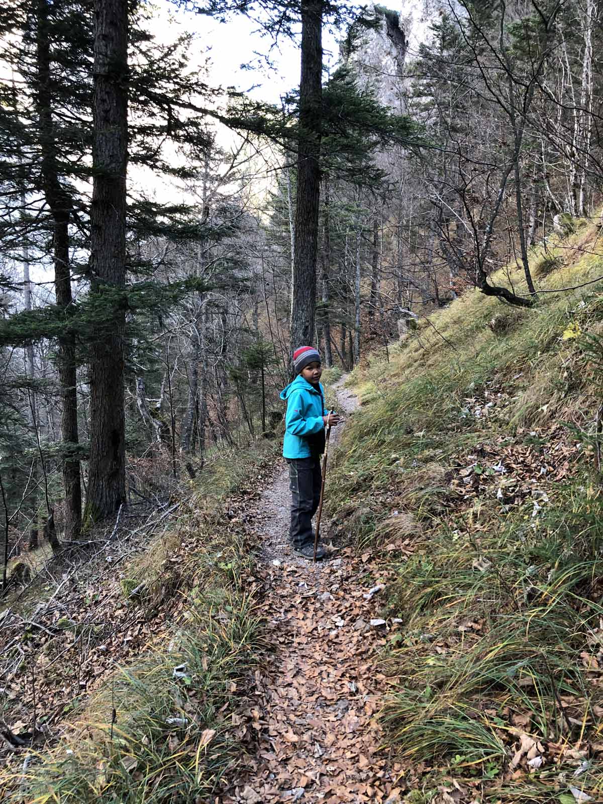 Der erste Teil des Aufstiegs erfolgt über eine vereiste Straße, dann zweigt der weitere Pfad in einen Hohlweg. Dieser ist angenehm zu gehen, die Steigung ist moderat, gerade richtig zum warm laufen.