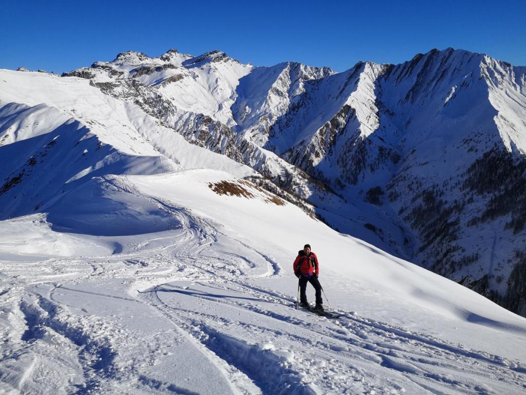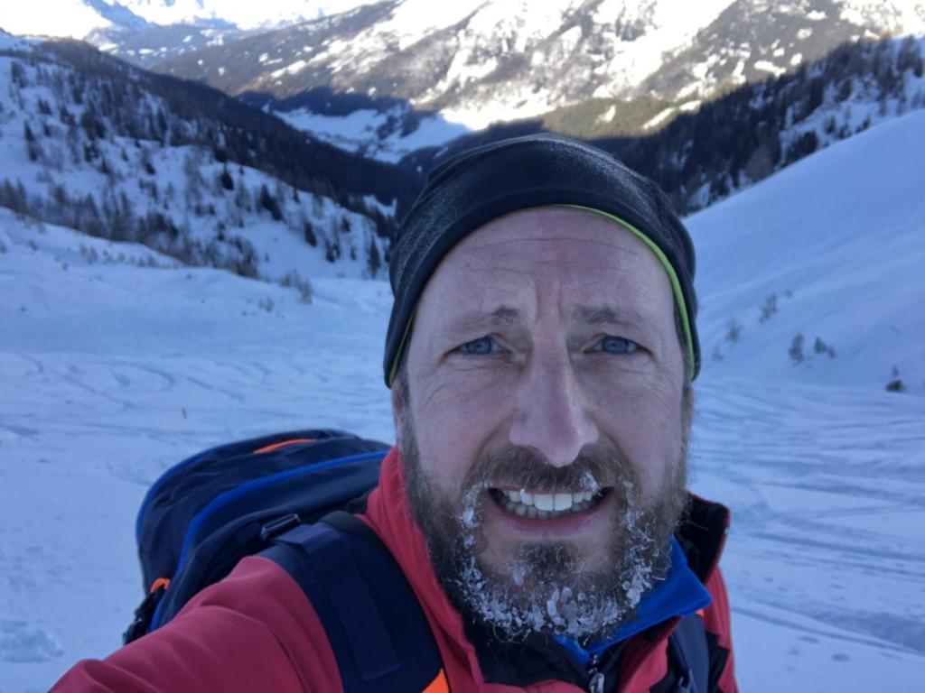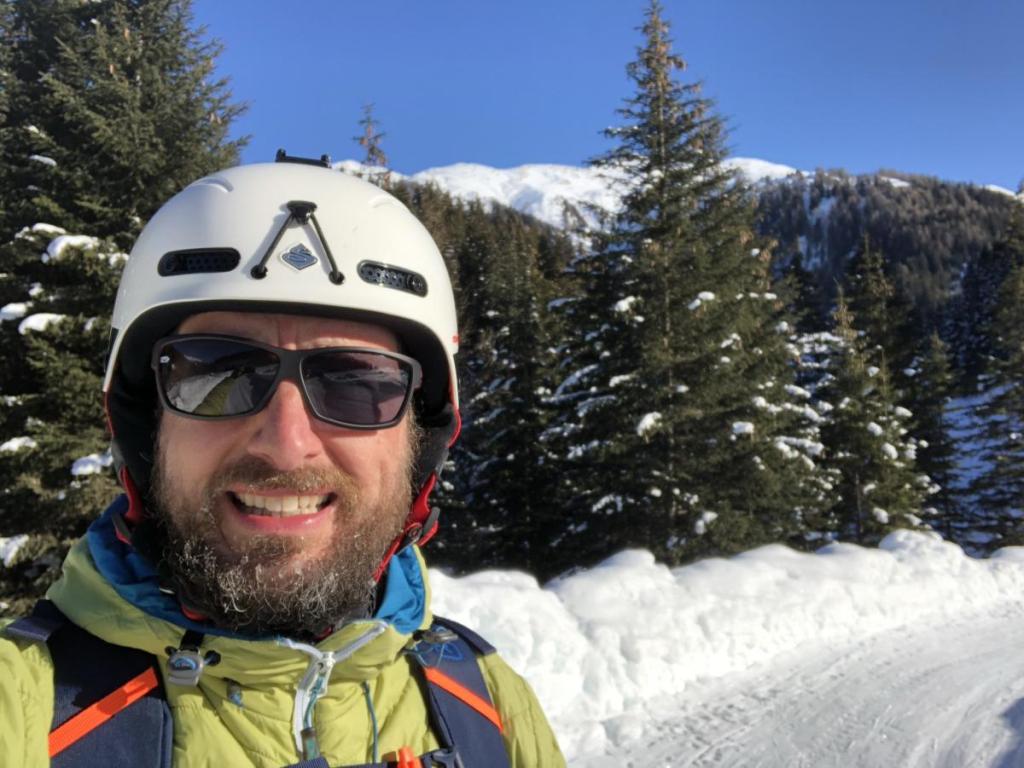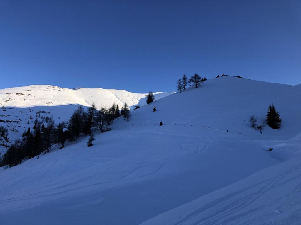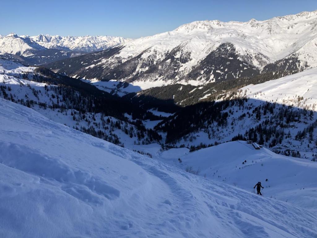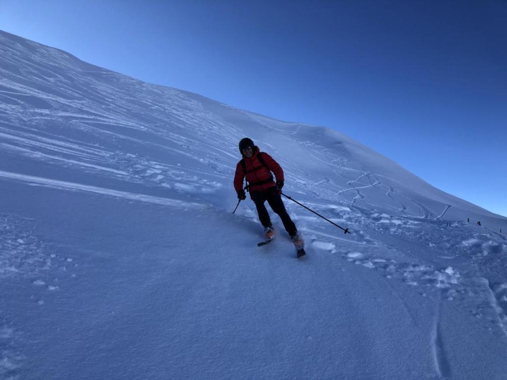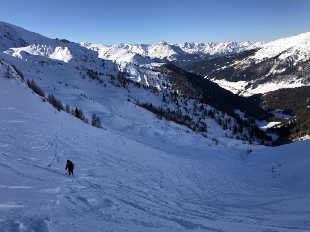 Dennoch haben wir heute super Verhältnisse, der Pulver ist zwar nicht mehr so pulvrig, aber dennoch gut zu fahren. Und die Lawinengefahr ist heute auch sehr gering, noch geringer, wenn man im verspurten Bereich bleibt.